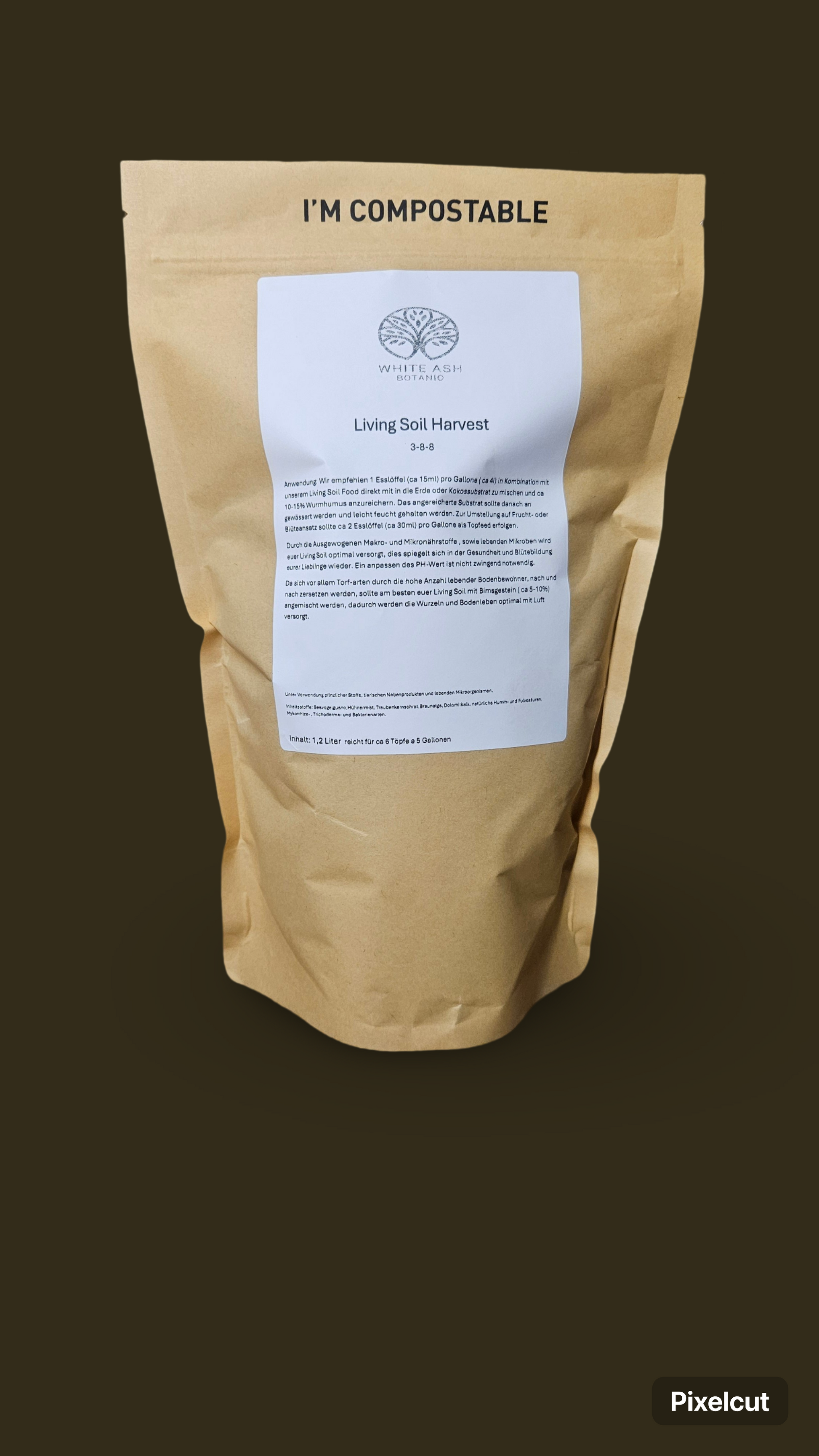 Anwendung: Wir empfehlen einen Esslöfffel pro Gallone (ca4L) Living Soil Harvest mit in das Substrat zu mischen. Als Topfeed in der Blütephase ca 2 Esslöffel auf dem Substrat verteilen und eingießen.